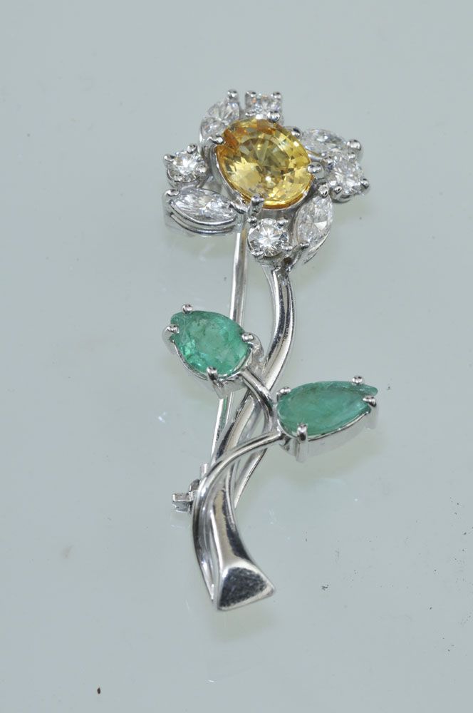 Technika: 18 k biele zlato, váha 7,1 g, diamanty cca 0,9 ct, smaragd cca 0,85 ct, citrín cca 1,3 ct