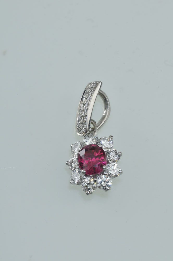 Technika: 18 k biele zlato, váha 1,8 g, diamant cca 0,8 ct, rubín cca 0,65 ct