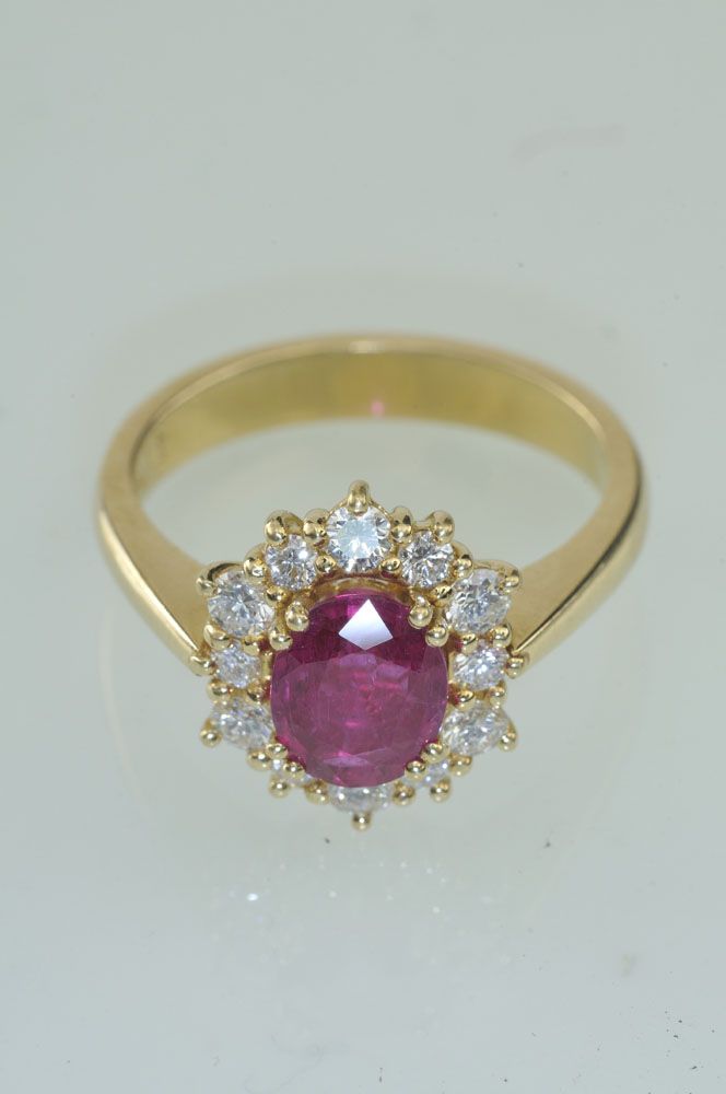 Technika: 18 k žlté zlato, váha 6,4 g, diamant cca 0,5 ct, rubín cca 1,75 ct
