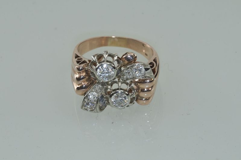 Technika: Bi color 14 k zlato, váha 8,8 g, diamanty cca 1,05 ct, velkost 62