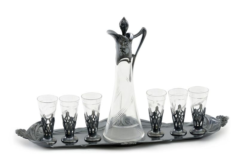 Najvyššie dosiahnuté konečné ceny diel autora: set pozostáva z podnosu, karafy s kovovou zátkou a 6 pohárikov vkladaných do kovových košíčkov.