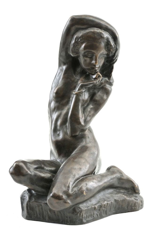 1 600,- € Sediaca so zaklonenou hlavou. Okolo 1910. Bronz. Výška 48 cm. (89. zimná aukcia, 1. 12. 2009)