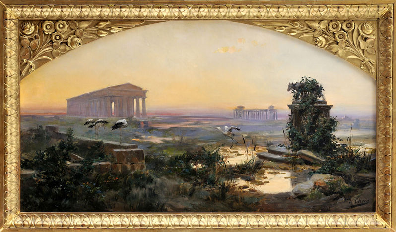 „Antická krajina“ je kvalitným a vzácnym príkladom európskeho symbolizmu Ulpiana Checa Y Sanza, španielskeho maliara a sochár svetového významu. Veľké nadanie sa u neho prejavovalo už rannom veku a tak už ako trinásťročného ho prijali na Escuela de Bellas Artes v Madride (prof. P. Gonzalvo, M. Dominguez, F. de Madrazzo, A. Ferrant). Vďaka vynikajúcim školským výsledkom a výnimočnému nadaniu sa stáva v škole asistentom a podieľa sa zo svojim bývalým profesorom Manuelom Dominguezom na výzdobe Palacio de Linares a Baziliky San Francisco el Grande v Madride. Prvé významné ocenenia získava už v roku 1880 a roku 1884 Veľkú rímsku cenu Madridskej akadémie a štipendium na španielskej Akadémii výtvarných umení v Ríme. Tu maľuje veľkoplošný obraz „Invázia barbarov“, s ktorým vyhráva roku 1887 zlatú medailu na Národnej výstave výtvarných umení v Madride. Madridské Museo de Arte Moderno kupuje jeho obrazy, získava všeobecné uznanie a ocenenia nielen doma, ale napr. roku 1888 vo Viedni. Od roku 1888 žije v Paríži a zúčastňuje sa pravidelne Salónu (debutuje obrazom „Znásilnenie Prosperiny“, ktorý spôsobí rozruch v španielskej akadémii), na ktorom získava v nasledujúcich rokoch i ocenenia. V roku 1890 sa ožení s Matilde Chayé zo zámožnej argentínskej rodiny a tak pravidelne navštevuje Južnú Ameriku, kde aj často vystavuje a predáva. Často vystavuje v Francúzsku, Španielsku i celej Európe, je úspešný nielen u publika, ale rešpektujú ho aj kritici - na Svetovej výstave 1900 získava zlatú medailu. Nepokojný duch a finančná nezávislosť mu umožňujú cestovať. Priťahuje ho aj Taliansko, Orient a Severná Afrika. Námety z ciest sa stávajú popri jeho tradičných antických a historických témach, či obrazoch Paríža, a krajiniek, čoraz častejšie. Zomrel vo Francúzsku, pochovaný je však podľa vlastného želania v rodisku Colmenar de Oreja, kde má v súčasnosti múzeum s významnou zbierkou. Najviac Checových obrazov je popri rodnom Španielsku a Francúzsku, i v muzeálnych či súkromných zbierkach v Južnej Amerike, najmä v Argentíne a Uruguaji. Okrem Paríža sú jeho obrazy v múzeách a galériách v Auxere, Angers, Amiens, Azule, Buenos Aires, Montevideu atď.