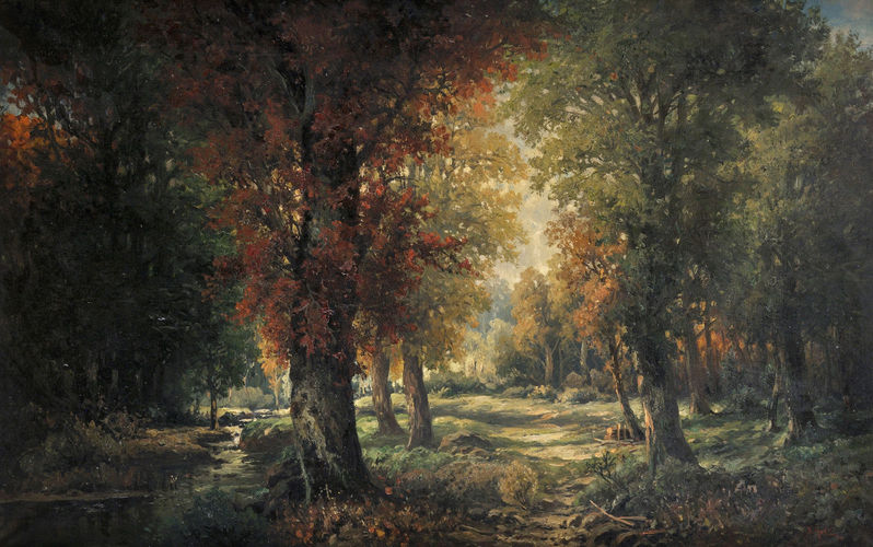 Popis: „Lesná cestička“ je reprezentatívnym dielom nemeckého- rakúskeho krajinára Adolfa Kaufmanna, pochádzajúcim z významnej bratislavskej zbierky 19. umenia konca 19. storočia.. Narodil sa v českej Opave, spočiatku bol samoukom a následne študoval v Paríži u Emile van Marcke de Lumen (1827 – 1890). Striedavo žil v Berlíne, Düsseldorfe, Mníchove, Paríži a vo Viedni, kde aj zomrel. Najmä Paríž a Francúzsko ovplyvnilo jeho tvorbu, pripomínajúcu diela barbizonských maliarov. Vlastným sa mu stal svojský maliarsky rukopis s výraznými farbami, dôrazom na silný kontrast v poetickom až tajomnom výraze (typickým príkladom je aj nami predkladaný obraz). Kaufmann bol známym cestovateľom - podnikal študijné cesty do Ruska, Nórska, Poľska, Holandska, Belgicka, Talianska i naprieč Orientom, ale vždy sa rád vracal do Francúzska a najmä milovaného Paríža (vo Francúzsku sa najčastejšie podpisoval pseudonymom Guyot). Autor už za svojho života získal veľké množstvo ocenení, v roku 1900 medailu pri príležitosti Svetovej výstavy v Paríži. Bol členom Wiener Akademie bildenden Künste a od 1890 do 1913 pravidelne vystavoval vo Wiener Künstlerhaus ako jeho člen. Bol obľúbený maliar aristokracie a to nielen rakúskej - veľa jeho obrazov zakúpili príslušníci rakúskeho cisárskeho domu - ale i napr. aj Napoleon III., ruský cár Nikolaj II., kráľovná Isabela II. Španielska, arcivojvoda Friedrich Tešínsky . Jeho diela sú vo viacerých svetových múzeách, galériách a súkromných zbierkach. Pre tureckého sultána Hamida namaľoval veľkoformátový obraz „Príchod do prístavu v Istanbule“. Viac obrazov vlastní napr. Leopold Museum vo Viedni, Umelecké múzeum v Istanbule, či Veľkovojvodská zbierka Baden-Badene. Pre maliara bolo okrem vlastného mena typické používanie viacerých pseudonymov, medzi inými aj J. Rollin, tak ako je signovaný aj ponúkaný obraz.
