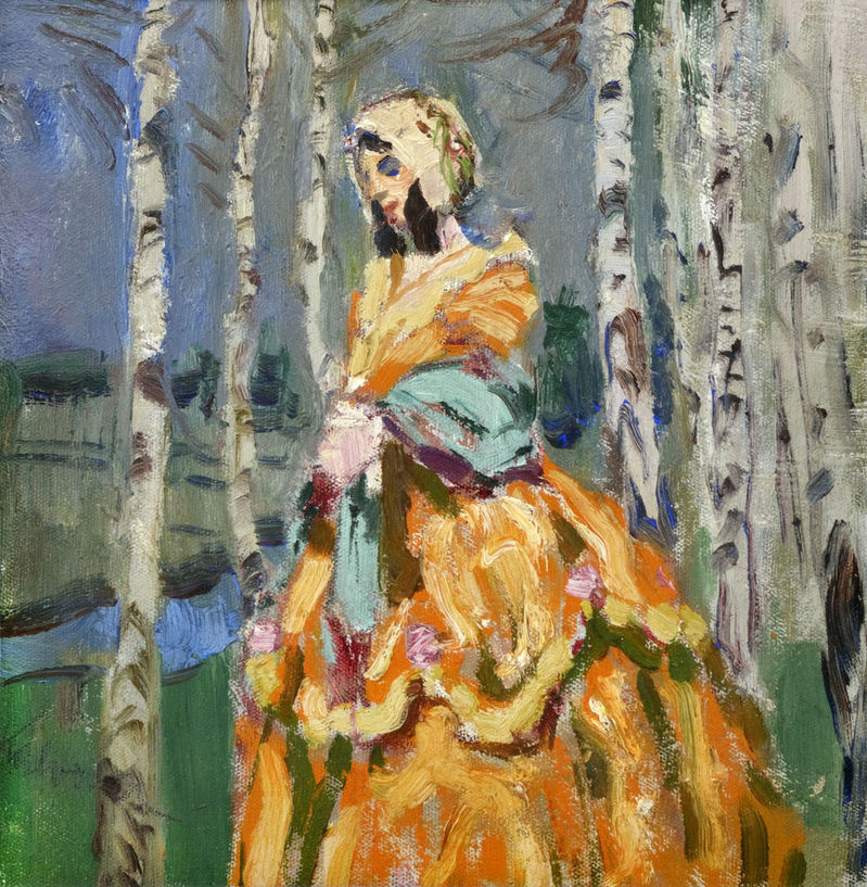 „DÁMA V BREZOVOM HÁJI“ je námetovo a štýlovo typickou prácou zrelého diela Aloisa Kalvodu. Patril nielen vekom, ale aj výtvarnou orientáciou k mladšej, slavíčkovskej a hudečkovskej generácii českej krajinomaľby. Jeho luminizmus, či kompromisný impresionizmus práve v prvých desaťročiach dvadsiateho storočia prekonával zlomové obdobie. Nadobúdal čoraz výraznejší secesný dekoratívny charakter, postavený na súzvuku dvoch-troch základných, náladovú atmosféru obrazu určujúcich farieb. Kalvodov secesný impresionizmus sa stal rozhodujúcim východiskovým podnetom pre novú nastupujúcu generáciu českého plenérizmu, ale aj napríklad pre mladého Martina Benku.