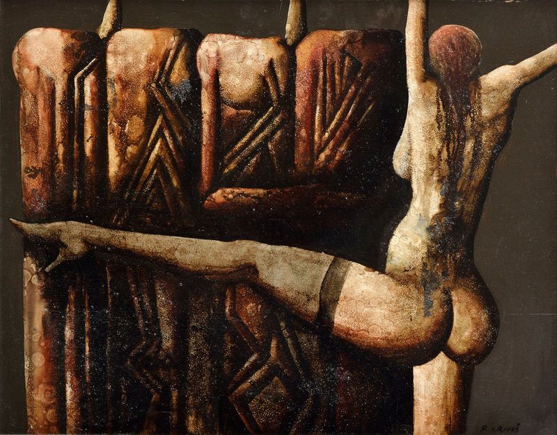 je reprezentačným dielom Rudolfa Krivoša, odkazujúcim na jeho novofiguratívnu tvorbu šesťdesiatych rokov. Podľa Kataríny Bajcurovej Krivoš „... v raných portrétoch a autoportrétoch z konca 50. a začiatku 60. rokov radikálnou zjednodušujúcou štylizáciou inšpirovanou kubistickou tvarovou dikciou prehodnocoval dovtedajšie mechanické prepisy optickej skutočnosti. Neskôr konštruktívne cítené tvaroslovie a sklon k výrazovej skratke prehodnotil expresívnymi a novofiguratívnymi prístupmi, sústredil sa na prácu s netradičnými materiálmi a technologickými postupmi. Vo figurálnej tvorbe sa podobne ako A. Barčík a M. Paštéka venoval „rúcaniu modiel“, pričom svoje archetypálne tvary umiestňoval do nečakaných, často konfliktných situácií, ktoré vyplývali z protirečivej povahy súdobej civilizácie, antropologických a existenciálnych problémov človeka.