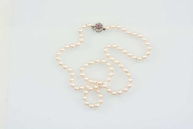 Technika: Uzáver 14 k biele zlato, 1 ks centrálny rubín, 8 ks briliantov spolu cca 0,12 ct, farba G-H, čistota SI1-I1, náhrdelník z kultivovaných morských perál kvality AA.