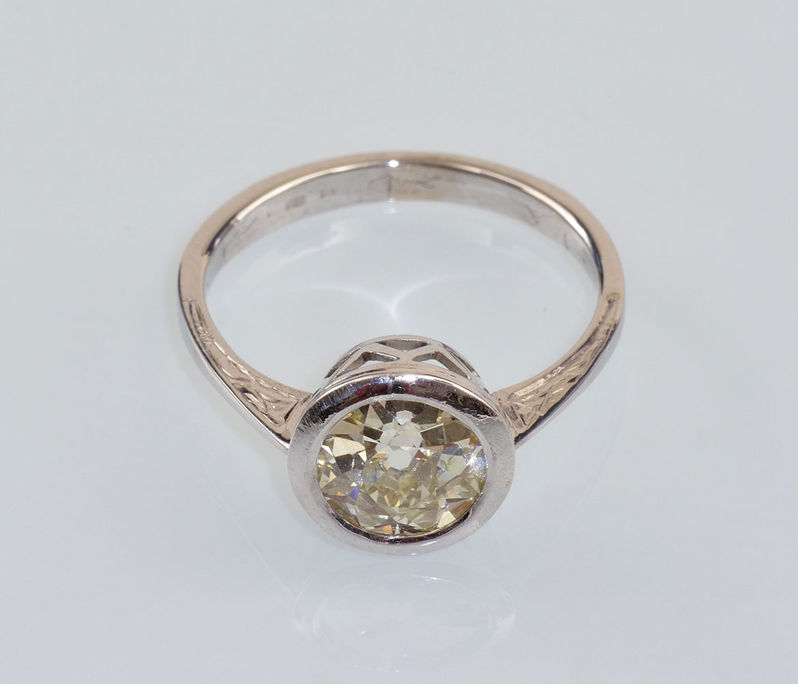 Technika: 14 k zlato povrchovo upravené ródiom, 1 ks solitér diamant,kruhový briliantový starý brús cca 1,8 ct, farba K, čistota VVS2