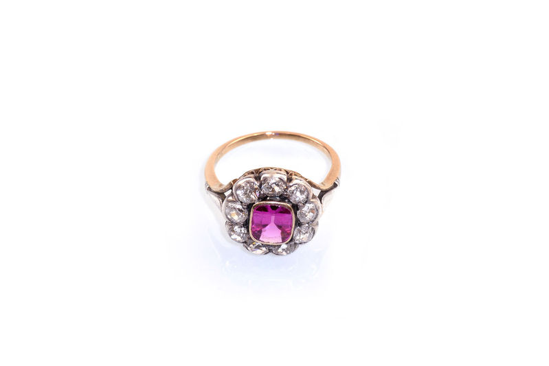 Technika: 14 k zlato, 9 ks diamantov spolu cca 0,9 ct, starý brús, čistota a kvalita stredná,