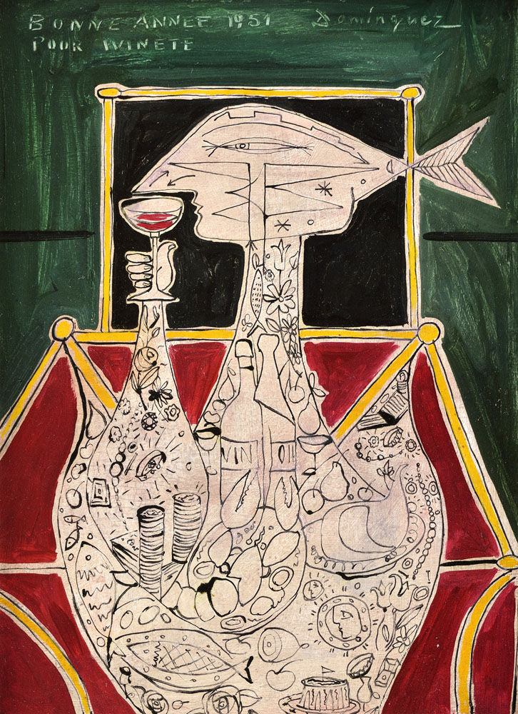 „BONNE ANNEE POUR WINETE“ je zberateľsky zauiímavým dielom Oscara Dominguéza. Patril ku kohorte španielskych nasledovníkov Pabla Picassa, bol však aj neortodoxným surrealistom. V 30. a na začiatku 40. rokov Domínguez spolupracoval so surrealistami, s André Bretonom a Paulem Éluardom. Spoznáva sa s Man Rayom, Wilfredom Lamom ai. 1928 sa pre vojenskú službu vracia späť do Španielska. 1928 vystavoval na Tenerife, spolu s francúzskou maliarkou Lily Guetta. 1931 zomiera jeho otec. Oscar sa začína živiť reklamnými ilustráciami. Rokom 1932 sú datované jeho prvé surealistické plátna. Ikonografia jeho raných obrazov sa odvíjala od charakteru fauny a flóry Tenerife - prevládali sopky, jaskyne a typická vegetácia ostrovov; kombinovaná s plechovkami, zatváracími špendlíkmi, zbraňami, šípkami, levmi a býkmi, ktoré sú súčasťou aj jeho surrealistických objektov. 1934 sa pripojil k okruhu André Bretona a je plne ponorený do surrealizmom svojich súputníkov: Salvadora Daliho, Maxa Ernsta, Yves Tanguyho, Victora Braunera a Roberta Mattui. Aj v tomto období ho inšpiruje krajina Kanárskych ostrovov - najmä nádherné jaskyne z Guanches (1935). Počas okupácie Francúzska žije v Marseille. 1941 sa pripája v Paríži k svojmu priateľovi poetovi Robertovi Riusovi - tu sa zúčasťňuje na aktivitách skupiny La Main à plume a stáva sa jedným z jej popredných ilustrátorov. 1943 sa uskutočnila jeho prvá samostatná výstava v galérii Louis Carré (úvodný text Paul Éluard), jeho dielo je pod značným vplyvom Picassovej tvorby. Nasleduje obdobie "vesmírneho času", ktorý je jedným z najzaujímavejších v jeho kariére, prvým dielom z nového cyklu je Podmorská krajina. Ďalší z jeho príspevkov do surrealistického hnutia bola teória petrifikácie času - jeho diela nadobudli novú formu sieťových štruktúr. Umelec strávil posledné roky svojho života v ťažkom utrpení a depresiách. Počas druhej svetovej vojny prebýval v Nemecku a Československu.