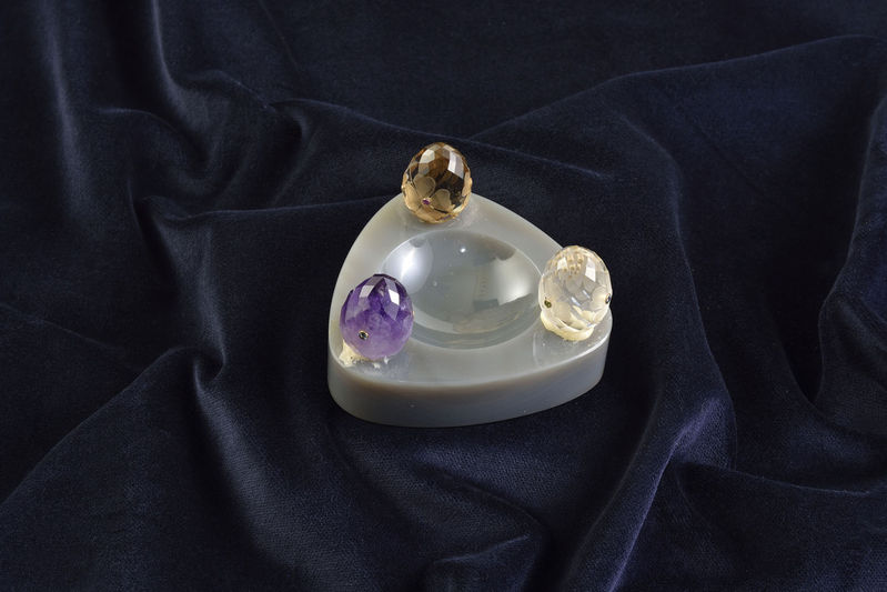 Technika: Achát, brúsený horský krištál, ametyst, topás, 3 zafíry, 3 smaragdy, 3 rubíny.