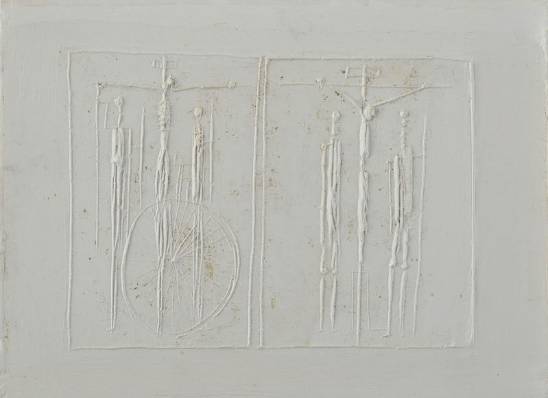 je jedným z prvých informelových diel Huga Demartiniho. Je považovaný za kľúčovú osobnosť českého sochárstva druhej polovice 20. storočia, priekopníka tzv. českej konštruktivistickej školy. Venoval sa prevažne abstraktnej geometrickej tvorbe. Po ukončení štúdia sa však v jeho umení uplatňovali aj prvky informelu. Neskôr sa začal zaoberať sakrálnym reliéfmi a papierovými kolážami, čím sa mu podarilo vymaniť sa z informelovej maľby. Začína vtlačovať najrôznejšie predmety do plôch mäkkej hliny, čím vytváral štruktúrované záznamy, ktoré takto prevádzal do negatívu v sadre. V šesťdesiatych rokoch vyšiel Demartini do krajiny, kde vytváral land artové objekty, ale aj jednorazové akcie, dnes zachytené len v dokumentáciách. K veľmi osobitým patria jeho priestorové kompozície z geometrických prvkov náhodne vyhodených do vzduchu. Zaujíma ho vytváranie štruktúr vyhodených tvarov, ich postupná premena počas letu i pádu. Stáva sa teda iba pôvodcom, hýbateľom - premenlivá vzťahová zostava vzniká iba pohybom jeho tela, vďaka jeho akcii. Výslednú kompozíciu autor nemení a prvky po dopade fixuje. Na pamätnej výstave Socha 1964 v Liberci vystavil "uväznenú plastiku"; sochu uzavrel do ďalšej sochy - schránky zo zváraných plechov, takže ju nemohol nikto vidieť. Ešte na konci prvej polovice 60. rokov sa stal jedným z protagonistov neokonštruktivizmu, hlásiacich sa k programu novej prírody a novej citlivosti. Dospel k priestorovej štruktúre, v ktorej boli jednotlivými prvkami rôzne - aj neúplné - gule. Veľkorysé poňatie (a to aj vo formátoch) ho odlišovalo od jeho kolegov. Postupne sa k štruktúre zapájal aj vonkajší priestor, vznikali akési schránky po geometrických útvaroch, ktoré autor čiastočne deštruoval. Od začiatku 70. rokov posilňoval minimalistické trendy svojej tvorby, ktoré dovŕšil v cykle "Modelov" - akýchsi belostných javísk bez aktérov uzatvorených do priehľadných sklenených schránok (1979). Modely postupne vyústili do sadrového cyklu topografických "Miest", ešte prázdnejších, ale rozľahlejších reliéfov "ničoho".