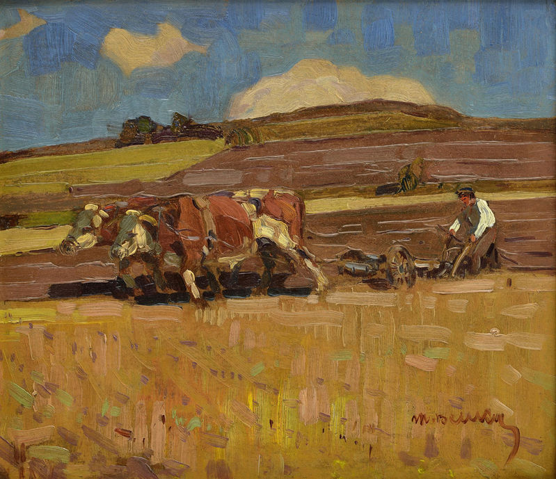 Popis: „Oráč“ je raným dielom Martina Benku. Jeho maľba úvodných rokov 1910 – 14 spela od významovo neurčitého secesného impresionizmu k znakovo čitateľnejšiemu secesnému symbolizmu. Ten sa ponajprv presadil v sérii interiérov slováckych izieb, sprevádzaných tematicky príbuznými olejovými štúdiami (Slovácka izba, 1914; Svadobná truhlica, 1914; Interiér izby u Tinku, 1914; Pracovňa dr. Alojza Kolíska, 1915; Interiér bytu dr. Kolíska, 1915; Izba z Ratiškovec, 1916, a ďalšie). Benka sa práve v tom čase postupne osamostatnil spod priameho dozoru učiteľa. Prvé Benkove slovácke izby vznikli práve vtedy, keď Kalvodu povolali k armáde. Po jeho demobilizácii sa stal seniorom školského ateliéru, Kalvodovým asistentom. Vyrovnanie vzťahu s učiteľom z podriadenosti a umeleckej závislosti do vzájomne sa rešpektujúcej kolegiality dovŕšil prenájom prvého Benkovho vlastného pražského ateliéru (1914) a napokon odchod do Miloňovíc pri Strakoniciach na veľkorysé pozvanie statkára rytiera Klenku z Vlastimilů (zostal tu až do konca vojny). Šumavské Miloňovice priniesli jasné potvrdenie prelomu: "Miloňovice boli medzníkom, novou etapou v mojom umeleckom vývine. Tu som začal vyjasňovať a upevňovať vlastný umelecký názor". Najmä veľkoformátové maľby z rokov 1915--1919 vynikajú slohovou vyhranenosťou a symbolickou nasýtenosťou a v tomto majú len málo čo spoločného s kalvodovskými náladovými, obsahovo vyprahnutými krajinárskymi štúdiami.