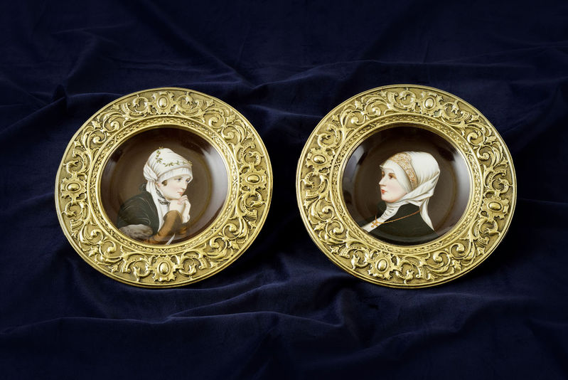 Technika: Nemecko. Ručne maľované so zdobenou mosadznou obrubou