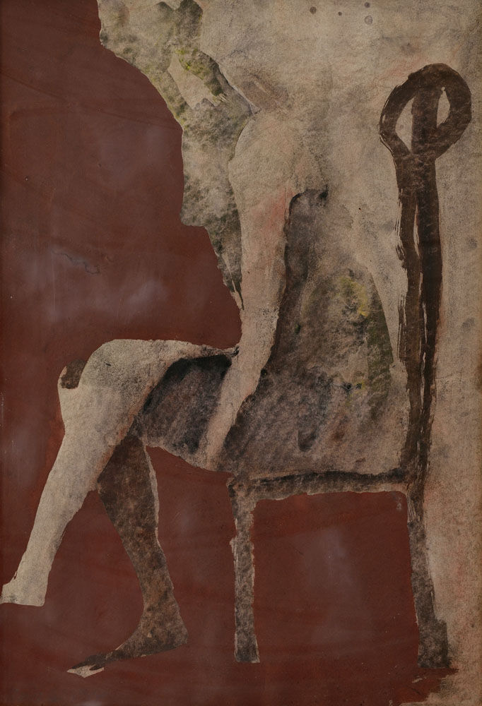 € 42 000 Sediaca (Na červenej stoličke). Okolo 1973-74. Olej na plátne. 71 x 91 cm. (108. zimná aukcia výtvarných diel a starožitností , 04.12.2012)