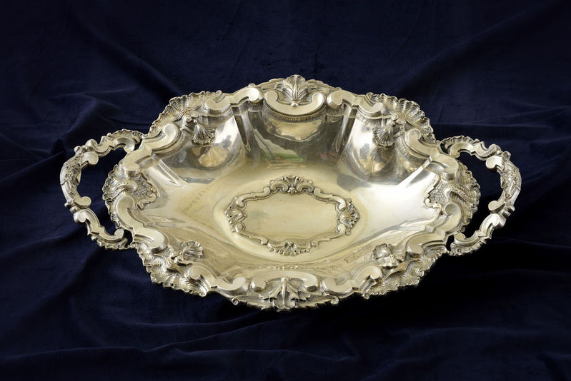 Technika: Striebro 833. Čiastočne lisované, ručne gravírované. váha 1 746 g