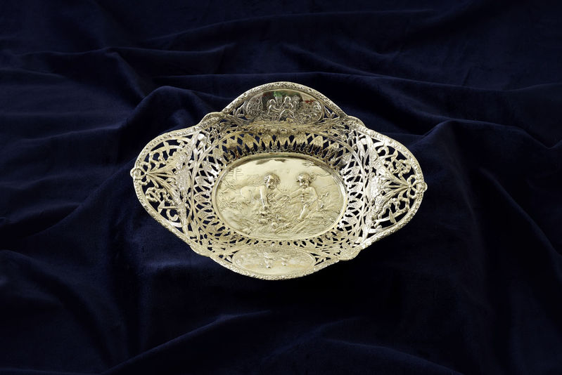 Technika: Prerezávaný košík s motívom galantnej scény a hrajúcich sa detí. 800 striebro. Váha: 291 g.