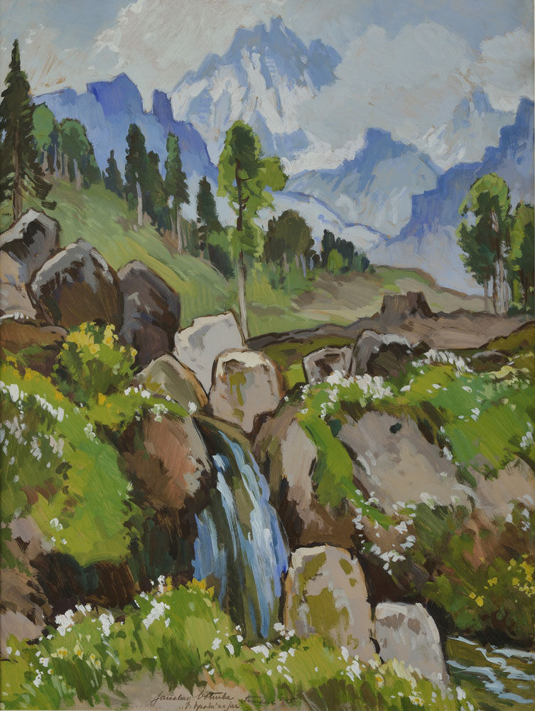 € 829,85 Dolina z Lomniska a Popradské Pleso. 1943. Tempera na papieri. 100 x 70 cm. (59. jesenná aukcia, 4. 10. 2005)