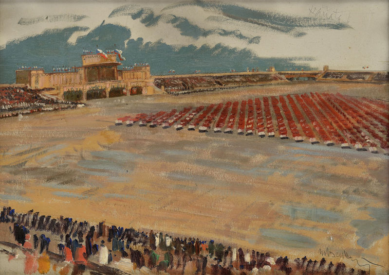 sú zvláštnym dielom Martina Benku, Podľa jeho monografistky, Kataríny Bajcurovej: „... patrí do známej série, ktorá vznikla na tému všesokolských sletov. Benka sám počas pobytu v Prahe (1909–1939) bol členom sokolského hnutia a realizoval aj niekoľko objednávok pre hnutie, čo spomína aj vo svojich pamätiach (Za umením. Bratislava : SVKL 1958). Je známych niekoľko diel na túto tému v zbierkach Múzea Martina Benku SNM v Martine: Sokolský slet, 1938, inv. č. B 114; Sokolský slet, 1938, inv. č. B 115; Všesokolský slet I.-V., 1938, inv. č. B 7174, 7175, 7176, 7177, 7178, všetko, olej lepenka; obraz Jízda VIII, 1926, v súkromnom majetku. Sokolskej tematike sa Benka venoval v rokoch 1926, 1928, 1929, 1930, 1932, 1937, 1938, keď sa konali všesokolské, krajinské a medzisletové podujatia v Prahe. Najčastejšími námetmi bol štadión, cvičenia, cvičenci, návrhy na rovnošaty, znaky, návrhy na pohľadnice a plagáty (IX. Všesokolský slet, 1932; Zájazd Československej obce sokolskej na Slovensko, 1932; Bratstvo, rovnosť, jednotnosť. Zájazdy Československej obce sokolskej na Slovensko a Podkarpatskú Rus, 1936; Všesokolský slet, 1938). K sletu v roku 1932, keď sa oslavovalo 100. výročie narodenia zakladateľa sokolského hnutia Miroslava Tyrša navrhol sériu pohľadníc (v zbierke SNM v Martine – Múzeum M. Benku)...“. Konanie VIII. všesokolského zletu roku 1926 sa prvýkrát sťahovalo z pražskej Letnej na Strahov , kde bol vybudovaný areál na rozlohe 60 hektárov, s tribúnami pre 130 000 divákov a cvičebnej plochy schopnej pojať viac ako 14 tisíc cvičencov. Do šatní sa zmestilo 35 000 osôb. Výstavba veľkého štadióne (neskoršieho Masarykova štátneho štadióne, približne na rovnakom pôdoryse, ako je dnes) bola sledovaná samotným prezidentom republiky už od jesene 1925. Sletu predchádzali nácviky v jednotách a župách, v sprievodných akciách boli aj lyžiarske preteky (nová tradícia Zimných sletových hier) v Krkonošiach , plavecké vo Vltave , vodácke v Jilemnici, preteky v atletike a mnohých športových odvetviach. Všesokolský zlet bol zahájený v nedeľu 13. 6. 1926 cvičením sokolskeho žiactva a 27.6. pokračoval vystúpením dorastu (13 887 chlapcov a 14 000 dievčat) za účasti prezidenta republiky T. G Masaryka. Hlavné cvičenia bola na Strahove v dňoch 4. - 6. júla 1926, cvičilo tu postupne 144 863 cvičencov pred preplnenými tribúnami (denne 160 000 divákov). Niektoré cvičenia sledoval prezident Masaryk priamo z náčelnického mostíka. V cvičeniach vystúpilo na ploche štadióne 14 680 žien a 14 125 mužov.