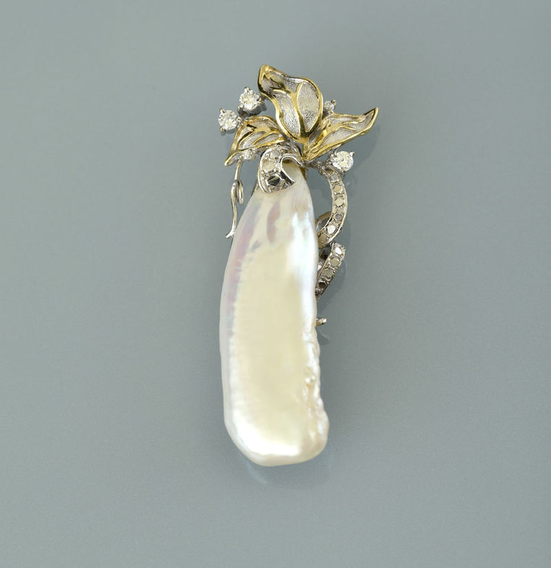 Technika: Diamanty, veľká prírodná perla, 18 k zlato. Diamanty spolu cca 0,2 ct. Čistota VS1-SI1, farba: G-H