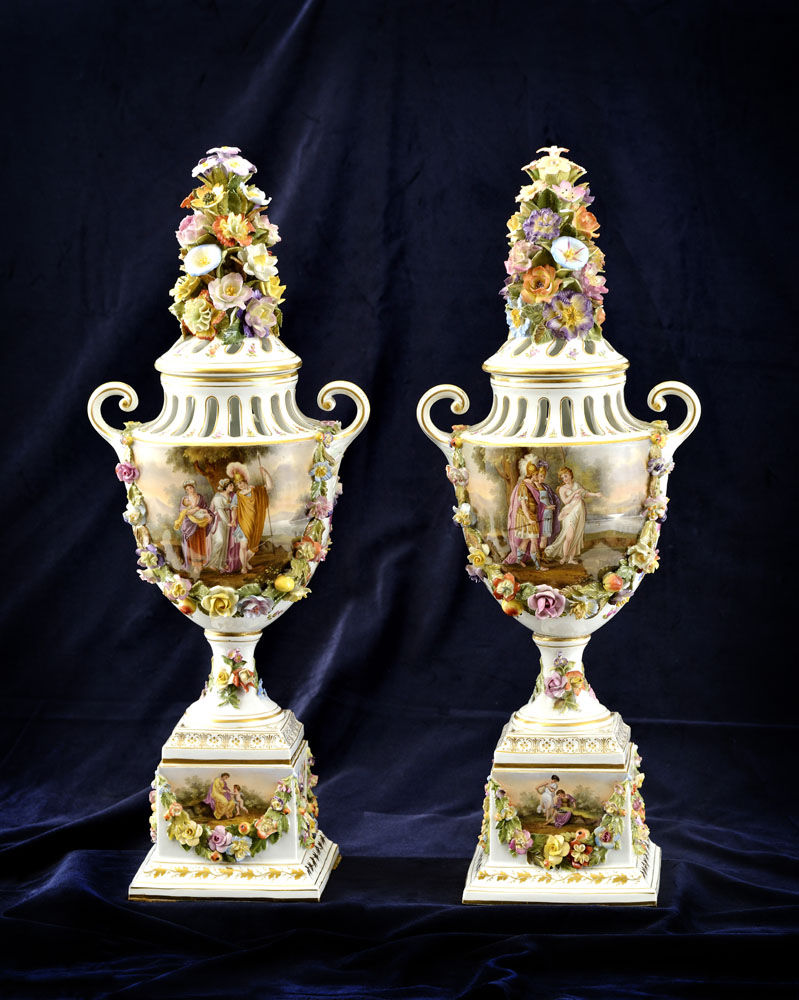 Technika: Ručne maľovaný porcelán s plastickými nálepmi kvetov a mytologickými výjavmi