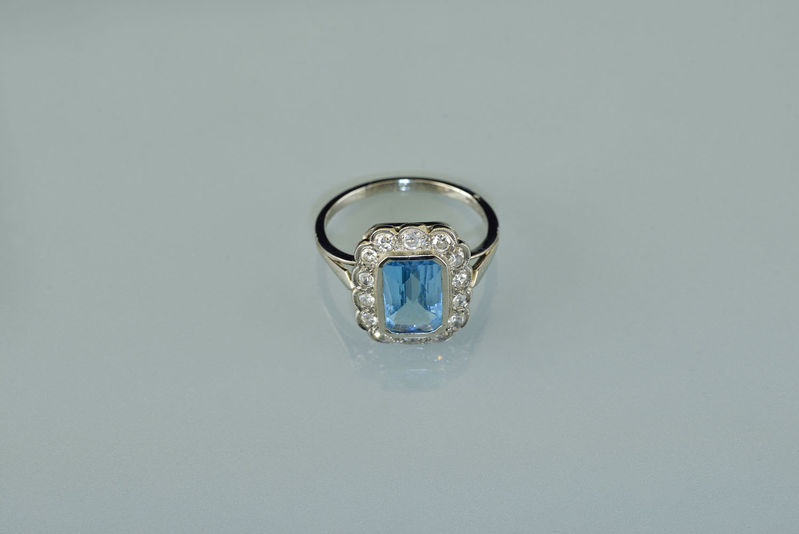Technika: 14 k biele zlato, 14 ks diamantov, starý brus, spolu cca 0,9 ct. 1 ks centrálny modrý topás cca 3,0 ct
