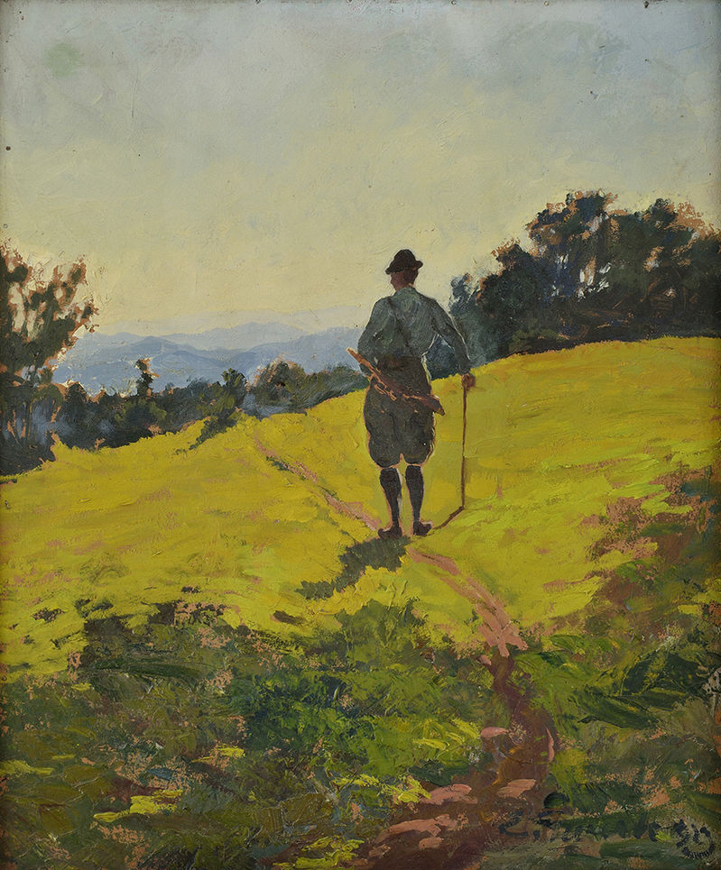 7 000,- € Opekanie slaniny v Štiavnických vrchoch. Okolo 1925. Olej na lepenke. 63 x 74 cm. (86. letná aukcia, 9. 6. 2009)