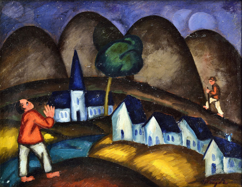 Proveniencia: Významná súkromná zbierka na Slovensku. Na zadnej strane štítok Maďarskej národnej galérie (september 1985). K dielu je priložený Atest Kieselbach Galérie v Budapešti č. KL 456 – 06487. Vystavované: „Ma“ III. demonstrativ kiállítása. Budapešť 1918 (pol. č. 29. katalógu - „A falu“)
