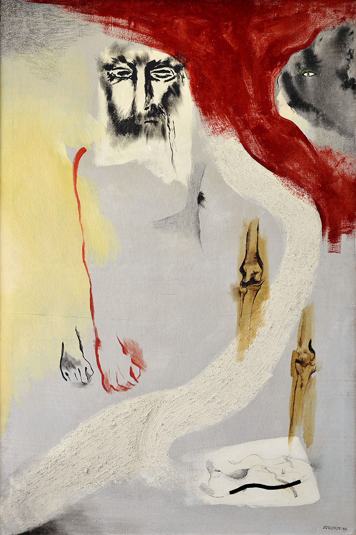 je reprezentačným, často publikovaným dielom Alexandera Eckerdta. Okolo tohoto košického, dodnes plne nedoceneného a umelecko-historicky nezhodnoteného maliara sa behom času vytvoril akýsi kult. Je maliarom pre zasvätencov, má svoj úzky, ale neobyčajne verný okruh obdivovateľov a zberateľov. Objektívne vzaté však – najmä v šesťdesiatych rokoch určite patril k progresívnemu jadru súdobého výtvarného diania. Podľa Zsófie Kiss-Szemán: “… na umeleckú scénu vstupuje koncom 50. rokov a snaží sa o programovo moderný prejav a výraz s novou formou. V prvej polovici 60. rokov maľuje obrazy so zredukovanou, temnejšou farebnosťou, voľnou skladbou a snahou vyrovnať sa s odkazom syntetického kubizmu. V jeho dielach prevláda poetickosť s reminiscenciami na M. Chagalla, ale aj na F. Tichého. Tieto snahy sú sprevádzané zrieknutím sa perspektívy, kompozičnou neviazanosťou a jasnou naratívnosťou, ktorej sa maliar napriek zdaniu nikdy nevzdal. Od 70. rokov v jeho maľbe sledujeme istú ustálenosť, a to nielen v kvalite, ale aj v tematických okruhoch: motívy lásky, rodiny, ženy, od konca 70. rokov najmä krajiny. Obidva tieto tematické okruhy dostávajú lyrický a meditatívny charakter. Eckerdt nachádza svoj štýl v hranatých figúrach umiestnených do civilného prostredia, ktoré ozvláštňuje svojskými poetickými metaforami. Vďaka týmto prvkom jeho tvorba dospieva na prah zvláštnej imaginatívnej maľby. Výrazná, až exaltovaná farebnosť diel sa postupne stupňuje, dôraz je kladený na jej priamu opticko-zmyslovú funkciu a jej intenzita sa pohybuje na hranici znesiteľnosti. Intuitívny prístup a výraz, sklony k poetizácii a záujem o automatizmus tvorivého procesu sa prejavujú najmä v kresbe a grafike, ktoré v umelcovej tvorbe predstavujú spolu s maľbou plnohodnotný umelecký druh…”. Známy košický kunsthistorik, kultúrny aktivista a umelcov priateľ, Gabriel Kládek pripomína Eckerdtovo umenie oveľa osobnejšie: “….ovládal fenomén obojručnej kresby. Ide o vskutku ojedinelú techniku. Bol ľavák, pravú ruku používal ako ľavú. Prioritu však mala ľavá ruka. Maľoval akt krásnej ženy tak, že aj v jednej aj v druhej ruke mal ceruzku a kreslil zároveň. Toto je aj vo svetovom kontexte veľmi významná vec, na jednej strane bol lyrický a na druhej strane nekompromisný človek… Už ako mladík mal veľké problémy v škole. Napríklad z gymnázia ho vyhodili s pätorkami na vysvedčení od hora až dole. On si to vysvedčenie rozmnožil a rozdával ho známym ako výsmech vtedajšieho školstva. Zobrali ho na VŠVU do Bratislavy, do ročníka súdruha Čemického. A ten ho vykopol s odôvodnením, že Eckerdt nemá cit pre farbu! Bol z toho nešťastný, možno by sa bol aj obesil, ale život mu zachránil Vincent Hložník, ktorý ho zobral späť do svojho grafického ateliéru. Hložníka považoval za svojho otca. Nebyť jeho, možno by bol z neho amatér. Eckerdt by dal aj život za pravdu. Bol jedným zo zakladateľov a kľúčových členov občianskeho hnutia Verejnosť proti násiliu v Košiciach….” .