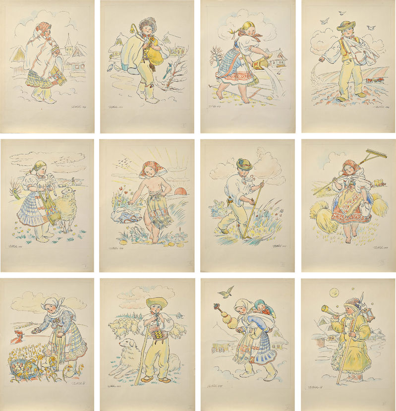 úzko súvisí s aktivitami Jana Hálu roku 1938. Vtedy sa totiž maliar zúčastňuje sa na výtvarnom dotvorení Poľnohospodárskeho pavilónu československej expozície na svetovej výstave v New Yorku, vytvorením keramického vlysu s námetmi Tanca a dvanástich mesiacov roka. Posudzované kresby sú zrejmým “vedľajším produktom” tejto štátnej objednávky. Súbor predstavuje galerijnú ukážku kresbovej tvorby Jana Hálu. Tematicky ide o žánrové výjavy viažúce sa k jednotlivým mesiacom roka života v podtaranskom Važci. Maliar zvolil osvedčený, v neskorom diele viacnásobne vyskúšaný sujet figúr važeckých detí na krajinnom pozadí. Kresby výrečne zastupujú poetiku Hálovho neskorého manierizmu, zviditeľnenie predstavy o národe uchovávajúcom i svojou fyzickou tvárnosťou „večné“, starobylé hodnoty, určujúce v čase i priestore nezmeniteľné rozmery jeho pozemského bytia. Neobyčajnú maliarsku sviežosť si - až do samého záveru umelcovej maliarskej aktivity - zachovávajú práve diela s motívmi hrajúcich sa či odpočívajúcich važeckých detí v krajinnom rámci letnej prírody (Malá Važťanka. 1941; Osvieženie, 1943; V prírode, 1947; Proti slnku, 1946; Pri husiach, 1948; Na slniečku, 1949; Dve žiačky, 1955). Ich výtvarné poňatie predpracoval už v sérii desiatich litografií, ktorú v roku 1933 vydal v spolupráci s Východoslovenským múzeom v Košiciach. Jeho vtedajší riaditeľ Jozef Polák uviedol bibliofíliu tak trochu nadnesenými, ale podstatu vystihujúcimi slovami: „... v těch školácích a husopaskách, buclatých batolatech, ve skotačivé klukovské divočině i v mateřsky něžném laskání děvčátek s bábkami, rozehřívá se jeho vlastní srdce nejvíce, rozbíhá se tužka nejlehčeji. Jim rozumí Hála, sám prosté, velké dítě, nejlépe...“ Obrazy važeckých detí, plné miloty a ľúbeznosti, sa mierou lyrického zaujatia preto zaraďujú medzi najosobnejšie realizácie Jana Hálu.