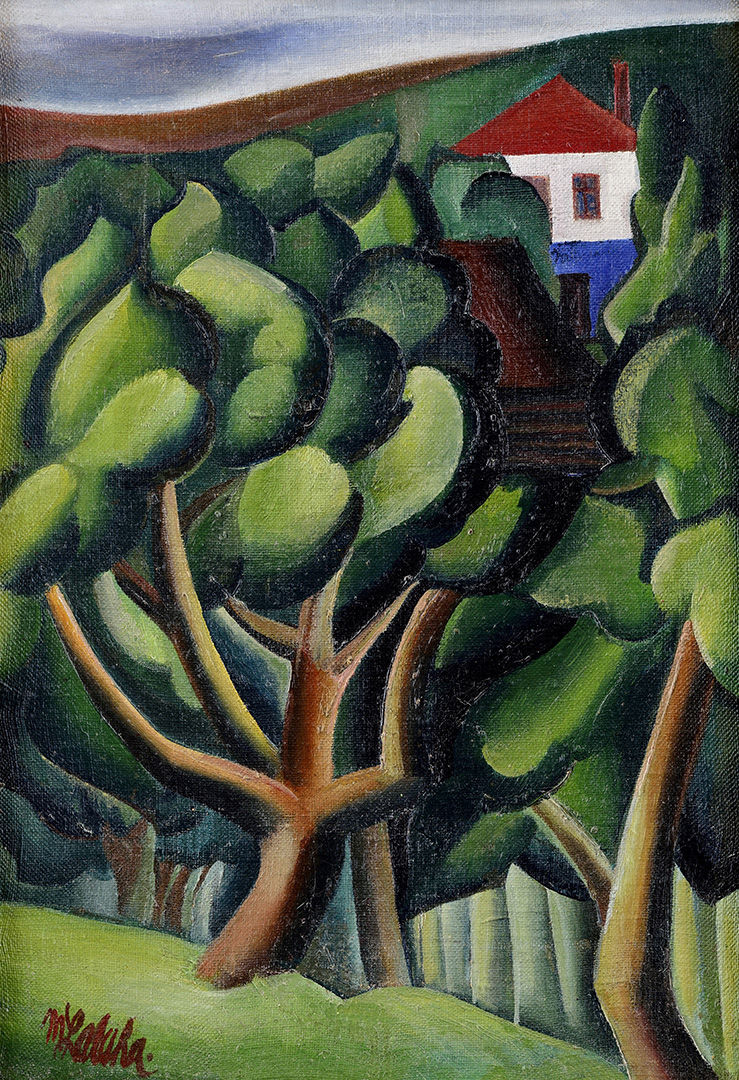 „Motív z Mičinej“ je zberateľsky vzácnym dielom ranej maliarskej tvorby Milana Laluhu. Podľa Kataríny Bajcurovej: „... v zmysle odkazu tvorby klasikov európskej a slovenskej moderny si Laluha vytvoril konštantný maliarsky štýl rozvíjajúci kubofuturistické východiská. Tvorí ho typický, monumentálne štylizovaný tvar nelomenej, ohnivej farebnosti uzavretý do racionálne definovanej lineárnej kontúry a kompozičnej skladby. Výtvarnú metaforu domova, harmóniu človeka a sveta nachádza v tradičnom, vidieckom prostredí: duchovným rodiskom jeho tvorby je stredoslovenská dedina Dolná Mičiná, krajina jeho detstva, ktorá sa mu stala umeleckým osudom. Veľmi skoro objavil a našiel svoj charakteristický výtvarný vzorec, tzv. laluhovskú formulu obrazu (Oskár Čepan), konštantný štýl, svojským spôsobom rozvíjajúci kubo-futuristické východiská. Obraz stavia z veľkých hranatých a zaoblených foriem, kresaných priam sochárskym spôsobom. Zároveň však tvary oživuje farbou – typickým žiarivým, až ohnivým akordom, k červenej a žltej pridáva zelenú a modrú farbu, doplňuje kontrastom čiernej a bielej. Raz volí mäkkú farebnú stupnicu, inokedy siahne po potemnelých tónoch a výsledkom je tlmený šerosvit. Tematizuje tu duchovné rodisko svojej tvorby, stredoslovenskú dedinu Dolná Mičiná, krajinu detstva a mladosti, ktorá sa mu stala umeleckým osudom. Nie je ale maliarom púhych folklórnych námetov. S mimoriadnou, priam halucinačnou posadnutosťou variuje vo svojej tvorbe rozmanité podoby tohto sveta: dedinu v nočných a denných podobách, stromy i domy, zátišia, ženy a mužov, koscov i hrabačky. Výsledkom je obraz pohybujúci sa na zvláštnej hranici zobrazujúceho a nezobrazujúceho, tradičného námetu a netradičnej, modernej formy, archaickosti a novátorstva. Obraz ako zvláštna vizuálna fikcia a poetická metafora zároveň...“.