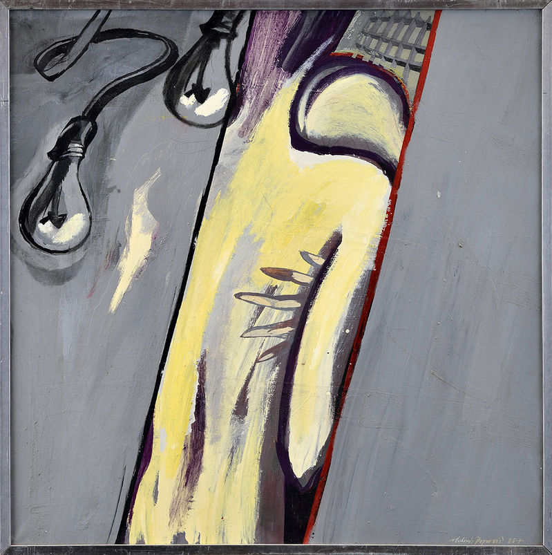 je galerijným dielom Vladimíra Popoviča. Pochádza zo známeho rovnomenného cyklu, ktorý sa stal maliarskou sondou do civilného života normalizačných rokov, odohrávajúceho sa v štandardizovaných betónových bunkách panelákov. Priamym impulzom pre jeho vznik bolo umelcovo presťahovanie sa do novovybudovaného sídliska. Cyklus charakterizuje radikálny odklon od „ikonografie šťastného obdobia“. Základným stavebným prvkom maľby je neosobné bytové jadro (často zobrazené aj v multiplikovanej podobe abstrahovanej bytovky). Zovretosť stien určuje izolovaný priestor, ktorý sa paradoxne stáva takmer jediným útočiskom - vzácnym miestom osobného prežívania. Umelcovo symbolické odovzdanie sa sivej farbe ešte viac zvýrazňuje pocit vyprázdnenosti a odcudzenia, ktoré v umelcovej maľbe dominovali takmer celé osemdesiate roky.