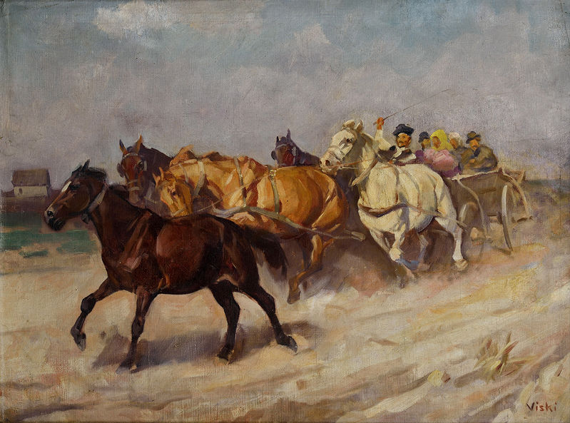 € 1 050,- Cválajúce kone na puste. Okolo 1930. Olej na plátne. 57 x 81 cm. (86. letná aukcia, 9. 6. 2009)