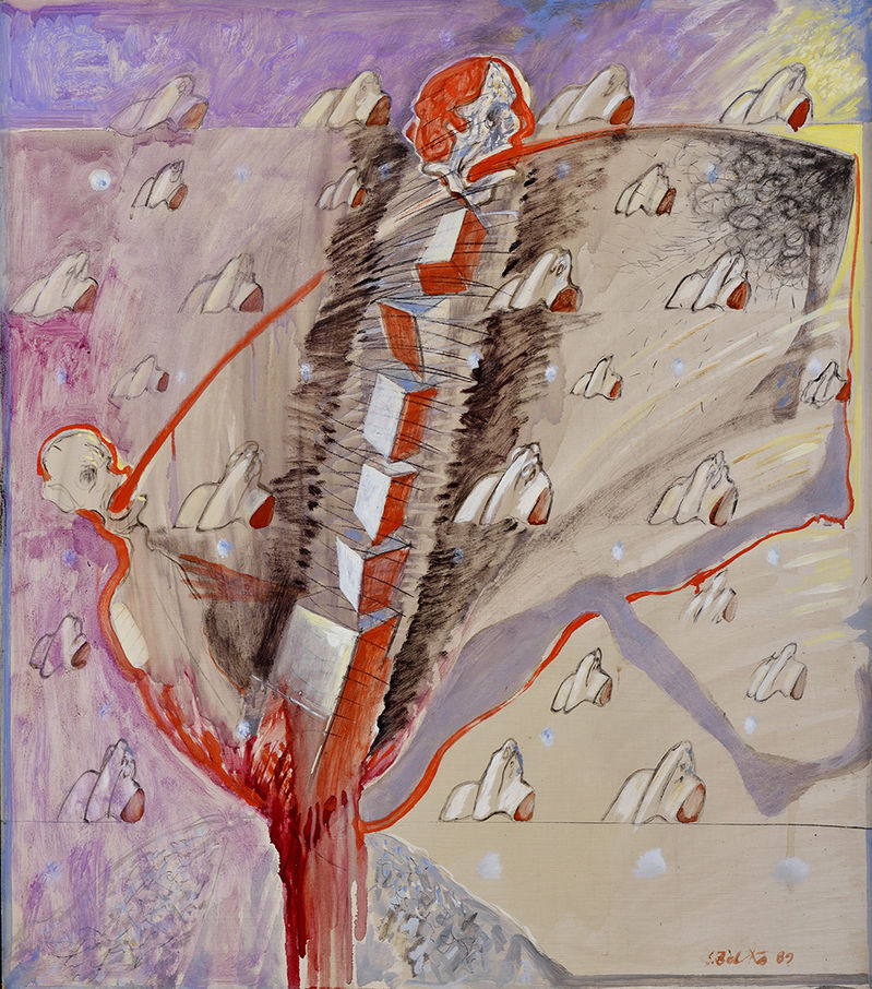 € 1261,37,- Bolesť v podživotnej veľkosti, z cyklu Bremeno. 1977-92. Olej na plátne. 76 x 98 cm. (14. jarná aukcia, 16. 3. 1999)