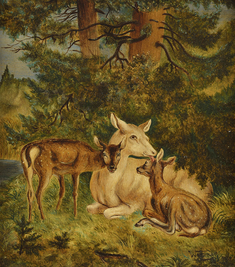€ 2 000,- Líšky a mŕtvy jeleň. 1845. Olej na plátne. 60 x 72 cm. Amsterdam 2004