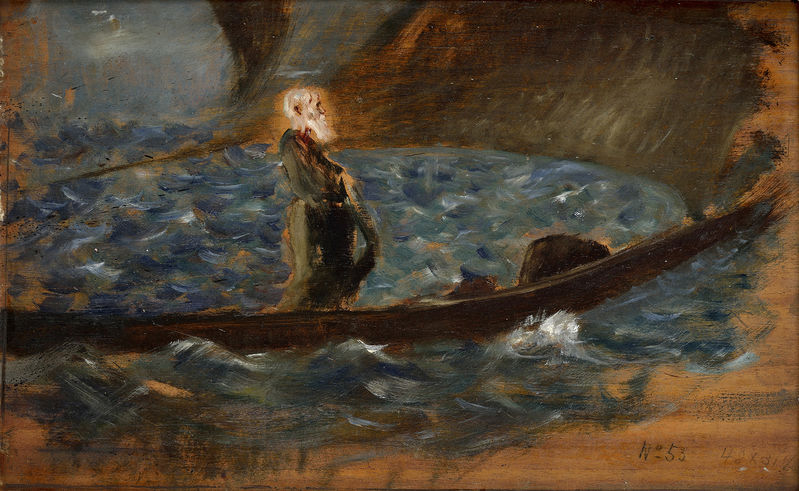 Popis: „Cháron“ je charakteristickým dielom prerodu Mednyánszkeho figuralistiky. Predovšetkým v maďarskej literatúre bolo už mnohonásobne popísané, ako sa z “dekadentnej”, secesnej moderny konca storočia napájal mysticizmus neskorého vrcholu umenia Ladislava Mednyánszkeho. V pozadí tohto makabristického obdobia umelcovej tvorby boli i traumatizujúce osobné okolnosti -- najmä ťažké ochorenie a potom smrť otca roku 1895. Duševná rozorvanosť, sebaspytovanie na existenciálne, posledné veci človeka, priam chorobné zaujatie obrazmi umierania, motívy prírodných katastrof a nešťastí, ale aj fantasmagorické vízie ťaživých snových výjavov celkom prevládli v sujetoch maliarovej neskorej tvorby. Predchádzajúci, istým sociografickým záujmom korigovaný pohľad na život dedinského a mestského proletariátu -- cigánov, tulákov, pastierov a sedliakov vystriedali podstatnejšie metafyzické ambície. Naturalizmus obrazov typických spoločenských outsiderov čoraz viac prekrýval zovšeobecňujúci akcent, poukazujúci viac na existenciálny, než spoločenský údel človeka, na zložitosti jeho tajomného vnútorného života. V istom zmysle sa maliar týmto spôsobom vciťoval do dvojznačného osudu vydedencov spoločnosti, ktorí napriek tomu (či práve preto), že boli opustení všetkými a zbavení všetkého, zostali duchovne slobodnými, od triviálnych vecí života nezávislými individualitami: "… dnes cítim po prvý raz, že uprostred života, pohybu aktivity môžem zostať sám a že mi nebude problémom privyknúť si na samotu. Jasne cítim, ako a do akej miery súvisím zo všetkým a že musím vyhýbať všetkému, čo mi je cudzie a čo ma vyrušuje. Všade a predsa nikde, nenávidiaci cudzotu, a predsa všade bez vlasti…".