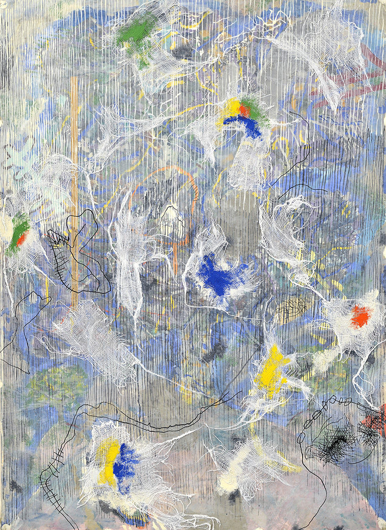 € 350,- Abstraktná kompozícia. 1994. Kombinácia kresbových techník na papieri. 60 x 42 cm. (111. letná aukcia výtvarných diel a starožitností, 11.06.2013)