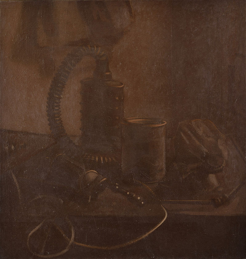 je rané dielo Mateja Kréna. Podľa Ivana Jančára: „...vychádza ... z princípu maľby starých Holanďanov a vytvára dielo plné tajomnej magickej atmosféry. Jeho hnedá monochrómnosť len zvyšuje tajomnosť diela, jednotlivé predmety na hnedom stole a hnedom pozadí akoby vystupovali z obrazu a zároveň sa v ňom strácali. Výber zobrazených predmetov – nádoby či plynová maska nás zase odkazujú do súčasnosti. Samotnej maľbe sa venuje už počas Štúdií, z hľadiska prelínania jednotlivých vrstiev a hľadania vnútornej podoby obrazu, či obrazov za obrazmi. Nezaujíma sa len o povrchové zobrazenie, ale skúma Ďalšie možnosti chápania a zobrazenia vnútorných nanovo odkrývaných priestorov. Proces premieňania materiálu farby alebo pigmentu ceruzky na niečo úplne iné sa stalo vlastne otvorením do vnútorného priestoru. Matej Krén sa stále považuje za maliara, pretože aj v iných médiách vytvára vlastne maliarske ilúzie Chápe umelca ako komplexnú bytosť a nie ako človeka, ktorý vytvára len obraz. V podstate maľovanie neopúšťa, maliarskymi kompozíciami je pre neho aj stavanie knižných objektov. Ideálna je synestézia, predstava sprevádzaná vnemami z iných zmyslových oblastí, teda komplexné dielo, ktoré nespolupracuje s človekom len na základe jedného zmyslu, ale komplexne. Matej Krén namaľoval veľmi málo obrazov (v súčasnosti je doložených 29 obrazov) a preto sú jeho obrazy prakticky nedostupné. Dielo sa vyznačuje svojou ojedinelosťou a kvalitou vysokej úrovne.