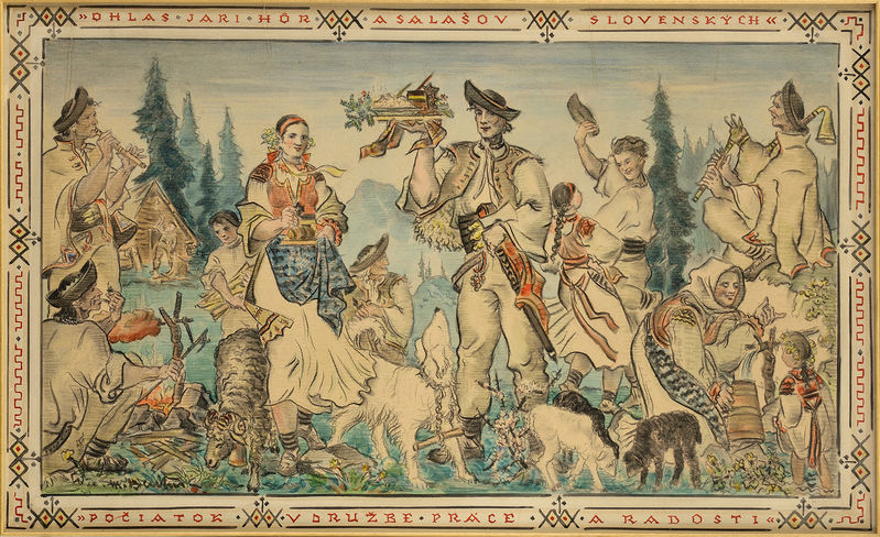 Popis: „Ohlas jari, hôr a salašov slovenských...“ dokladá štýlové a myšlienkové zámery posledného dôležitého Benkovho tvorivého obdobia. Vrcholí v období slovenského štátu, kedy sa stáva prirodzenou súčasťou oficiálnej ideológie, patetickými, mnohofigurálnymi kompozíciami rokov 1942--1949. Príznačne rovnako dobre zodpovedali umeleckému vkusu kultúrtrégrov "farskej republiky", ako o čosi neskôr požadovaným kritériám socialistického realizmu (cyklus Strážcovia a Ochrankyne Slovenska, 1942; Odolnosť, 1942; K výšinám jari, 1945; Na miestach padlých, 1946; Z bojov a žialov k slobode, 1946; Drevári pod Ďumbierom, 1946--1949; Stopy vojen (Stopy kultúr), 1947; Nad rodnou dedinou po povstaní, 1947). Benka tak „udal tón“ jednej z línií nacionálnotendenčnej maľby, znamenajúca v rovine štýlu prerod secesnej ornamentálnosti do akéhosi žánrového nazarenizmu, v rovine významu zasa zámenu výrazovej štylizácie reality života národa za jej inotajnú tematizáciu. Túto Benkovu periódu možno teda považovať za posledný prejav nášho maliarskeho postromantizmu.