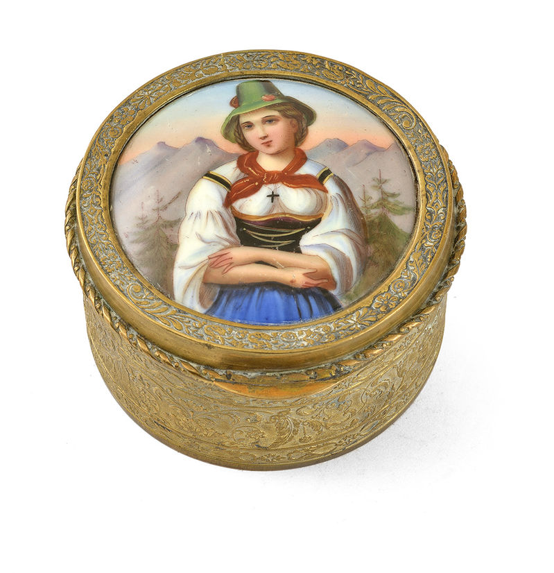 Technika: Mosadz, email, ručne maľovaný porcelán – dievča v klobúčiku
