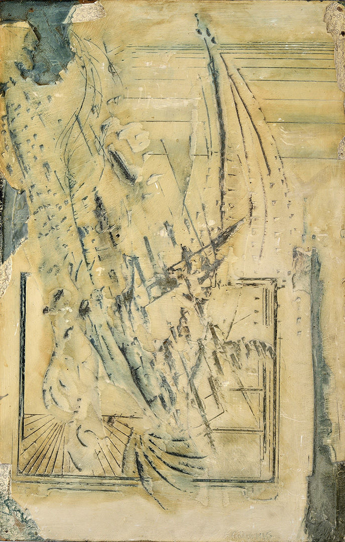 € 500 Čakanie. 2008. Kombinácia techník na sololite, 132 x 50 cm. (109. jarná aukcia výtvarných diel, 19.03.2013)