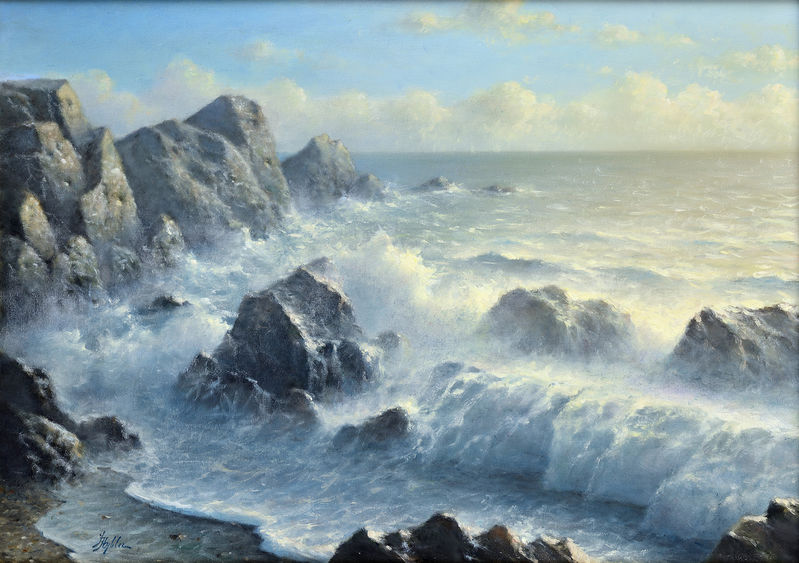 € 249,- Mesačný svit na pobreží s majákom. Olej na medenej doske. 18 x 23,5 cm. Mníchov 1992