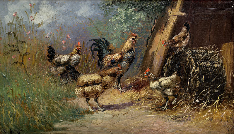 € 52,000,- Hydinový dvor. 1902. Olej na plátne. 39 x 49 cm. Kolín nad Rýnom 2002