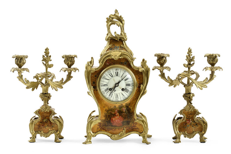 Technika: Maľované, lakované drevo, mosadz, emailový ciferník s miernymi prasklinami. Skrinka hodín s ručne maľovanými kvetmi a galantnou scénou.