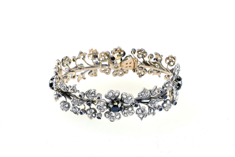 Technika: 18 k zlato, diamanty cca 1,6 ct. Tmavomodrý zafír cca 1,48 ct.