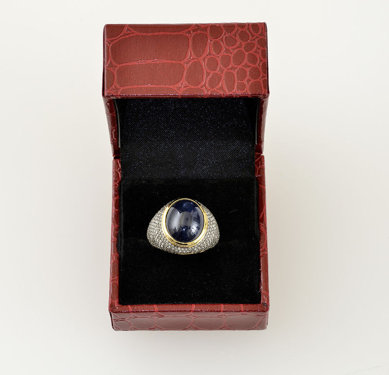 Technika: 14 k žlté zlato, diamanty cca 1,71 ct, modrý safír kabošon cca 19,64 ct