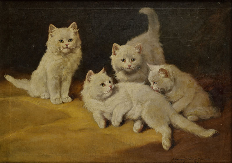 € 350 Pes a mačka. Okolo 1920. Olej na plátne. 48 x 60 cm. (98. letná aukcia výtvarných diel a starožitností, 07.06.2011)