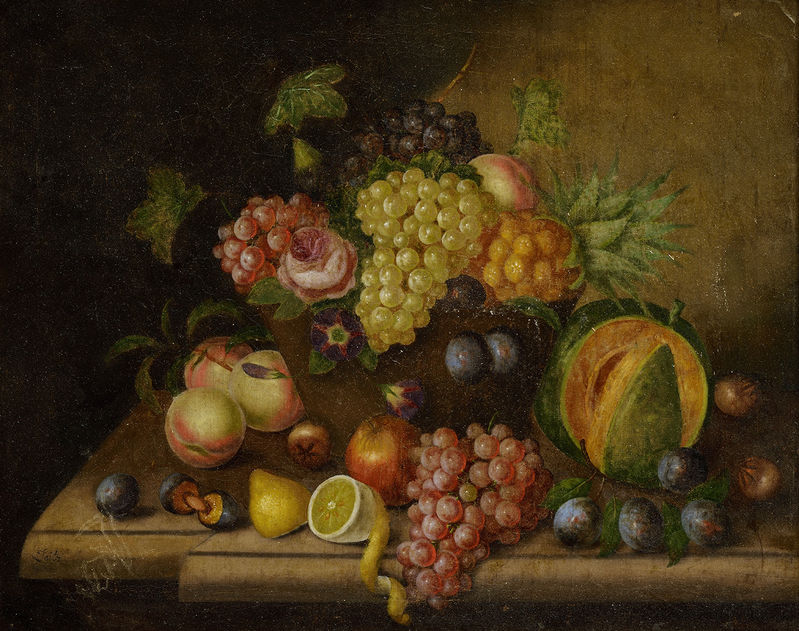 € 9,025,-Zátišie s ovocím. 1850. Olej na plátne. 94 x 78 cm. Londýn 1995