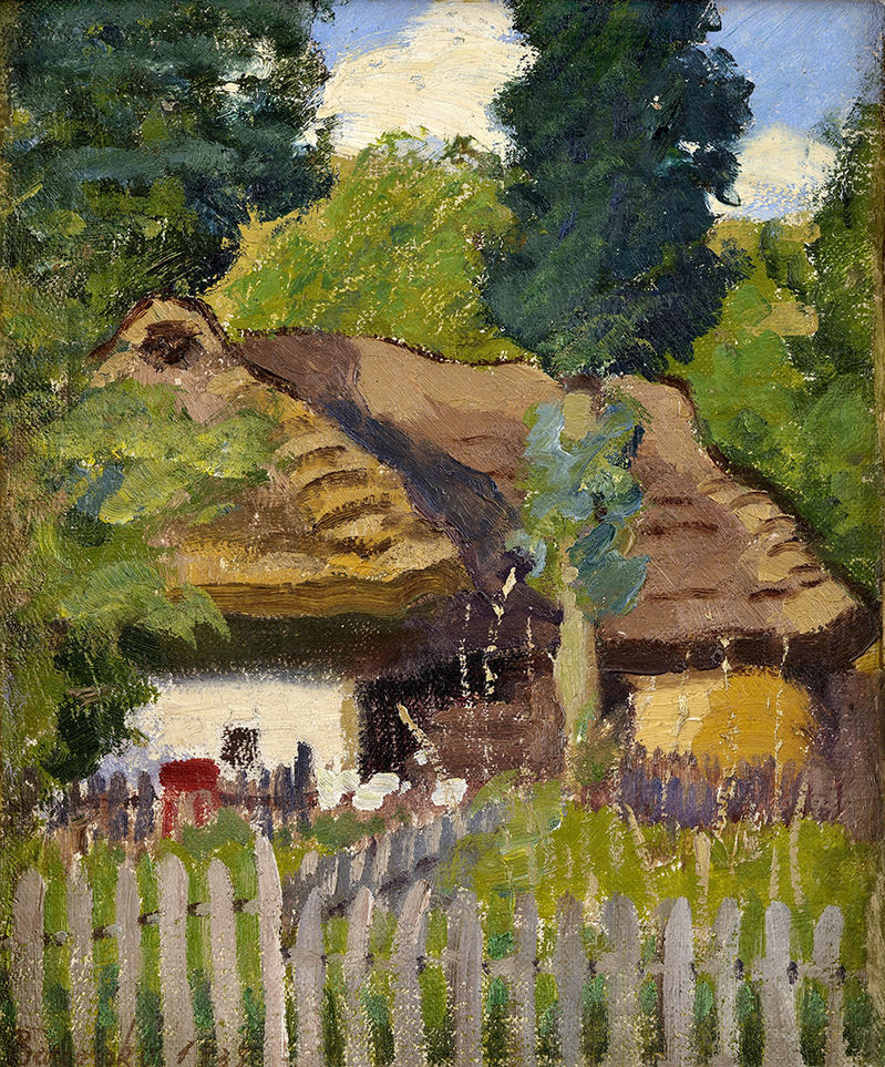 € 34 000,- Krajina s kostolíkom, sýpkou a člnom.. Okolo 1951-54. Olej na kartóne. 26 x 41 cm.(107. večerná aukcia, 13.11.2012)