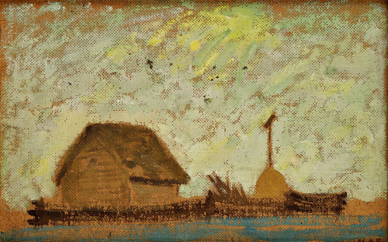 € 34 000,- Krajina s kostolíkom, sýpkou a člnom.. Okolo 1951-54. Olej na kartóne. 26 x 41 cm.(107. večerná aukcia, 13.11.2012)